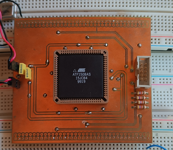 Il me faut maintenant du concret… Le temps de passer commande chez le chinois, je me confectionne une carte de prototypage pour faire mes premières mises en situations. Une carte simple qui me permet de raccorder la puce sur une plaque à trous, de gérer l’alimentation et le port JTAG sur des connecteurs.