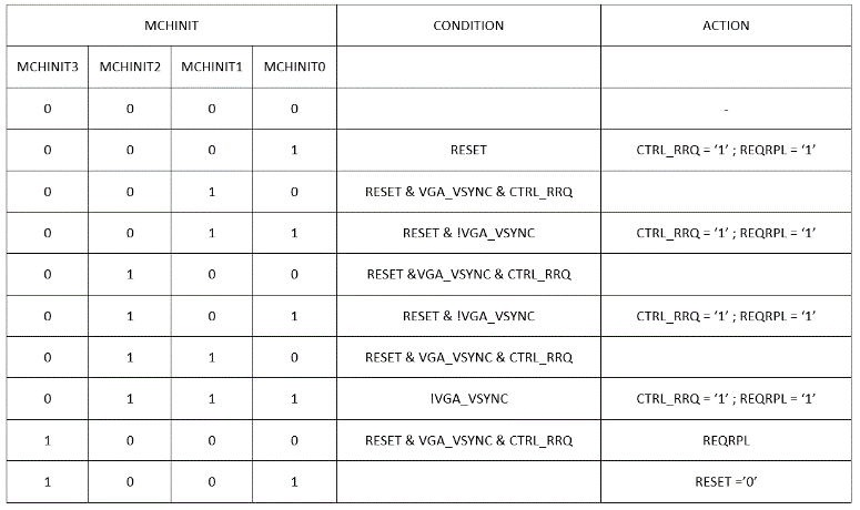 Pour déclencher un remplissage il suffit positionner CTRL_RRQ à ‘1’ à quatre reprises en ajustant la valeur des plans mémoire successivement à 0, 1, 2 ou 3. Les changements d’état de la machine sont décrits par la table de vérité :