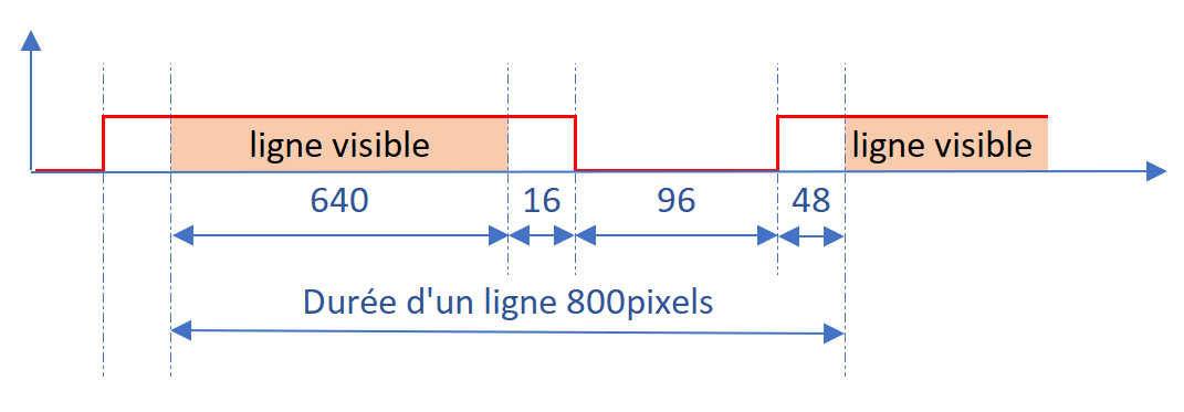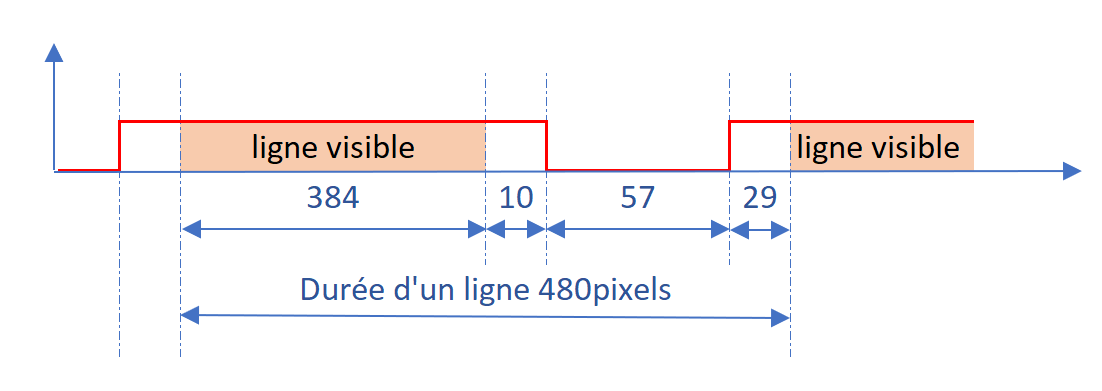 Il nous faut cependant adapter le nombre de pixel à notre résolution avec une ligne visible de 384 pixels. On obtient, dans le rapport de fréquence 15MHz/25,175MHz la correspondance suivante :