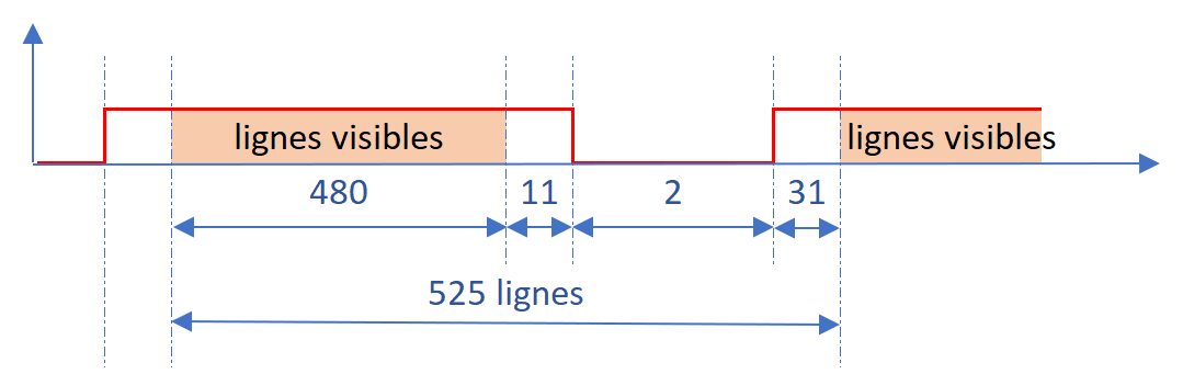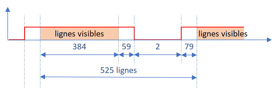 De la même manière que pour la synchronisation horizontale, il est nécessaire d’adapter au nombre de lignes. En effet afin de conserver des pixels carrés nous allons répéter chaque ligne une fois pour atteindre un total de 2 x 192 = 384 lignes. Nous allons également centrer ces lignes dans la zone visible. Cela nous donne 480-384 = 96 lignes soit 48 lignes de part et d’autre ce qui nous donne :