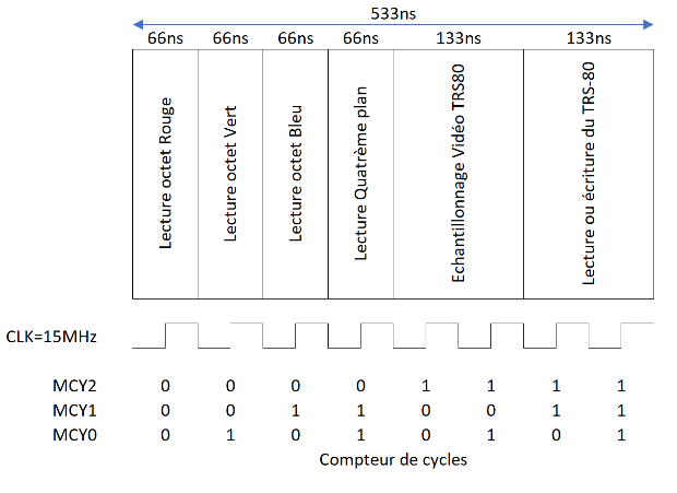 Avant toute chose, il faut réfléchir à ce qu’il possible de faire en terme d'organisation des transactions temporelles sur la mémoire. Après tout il s'agit d'un périphérique partagé entre le processeur, la génération de la vidéo et la mémorisation de la vidéo texte du TRS-80.